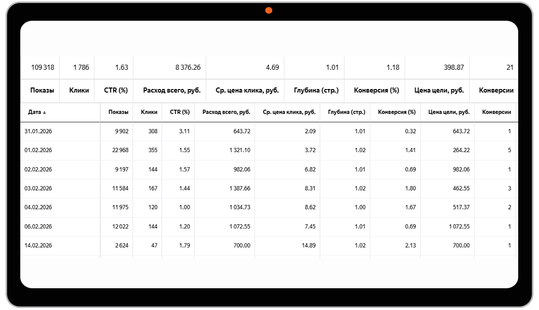 Вы в любой момент видите весь отчёт: сколько потратили, сколько было кликов, сколько заявок. Никаких скрытых комиссий.